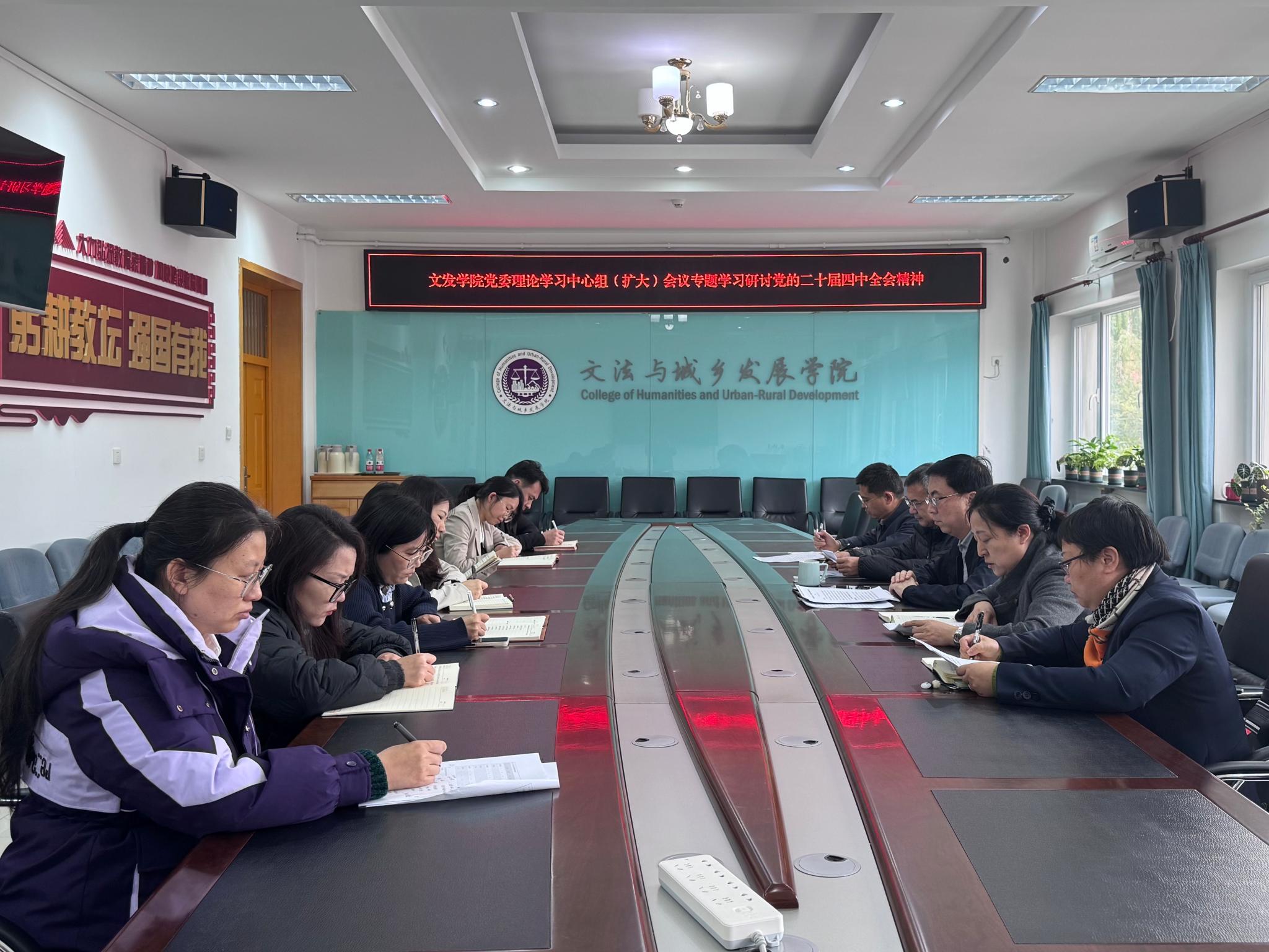 10月29日下午,文发学院召开党委理论学习中心组(扩大)会议专题学习研讨党的二十届四中全会精神。中心组成员紧密围绕贯彻落实全会精神,扎实推进学院工作高质量发展,结合岗位工作和分管领域交流学习体会。各党支部书记参加学习。会议由党委书记赵和文主持。