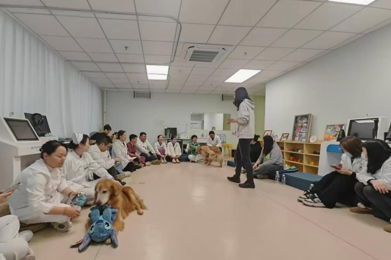 在活动中,小汤山医院副院长王莉教授带领该院医务办公室、护理部、医务社工部、作业疗法康复科、物理疗法康复科、儿童心理干预中心以及中西医结合诊疗科等部门业务骨干参与了全程活动。北京农学院师生详细介绍了抚慰犬的训练标准与安全规范,并指导小汤山医务人员通过阶梯式互适应体验,亲身感受了抚慰犬带来的平静与专注的氛围,深刻理解了其作为“治疗媒介”在调节治疗氛围、降低烦躁、缓释焦虑情绪等方面的重要作用。